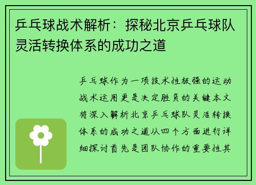 近年来,北京足球队在竞技水平和心理素质方面取得了显著进步。尤其是在心理素质方面的创新高,吸引了众多媒体和球迷的关注。本文将从四个方面详细探讨北京足球队如何通过提升心理素质来助力未来的发展:首先,分析心理素质对球员个人表现的重要性;其次,探讨团队凝聚力与心理素质之间的关系;第三,研究教练团队在心理辅导中的作用;最后,总结良好的心理素质对球队整体成绩的影响。希望通过这些分析,为北京足球队未来的发展提供...